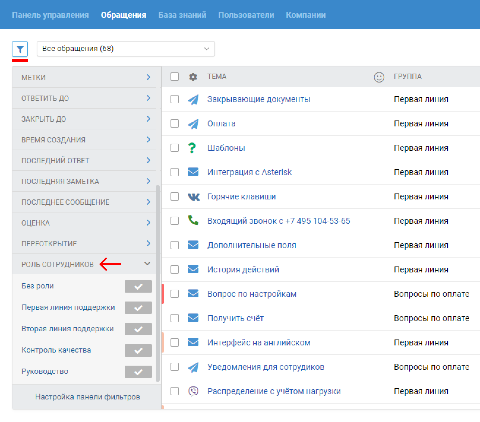 Когда есть созданные роли, в общем списке обращений добавляется отдельный фильтр. В нем отображаются обращения, в которых ответственными выставлены сотрудники с определенной ролью.