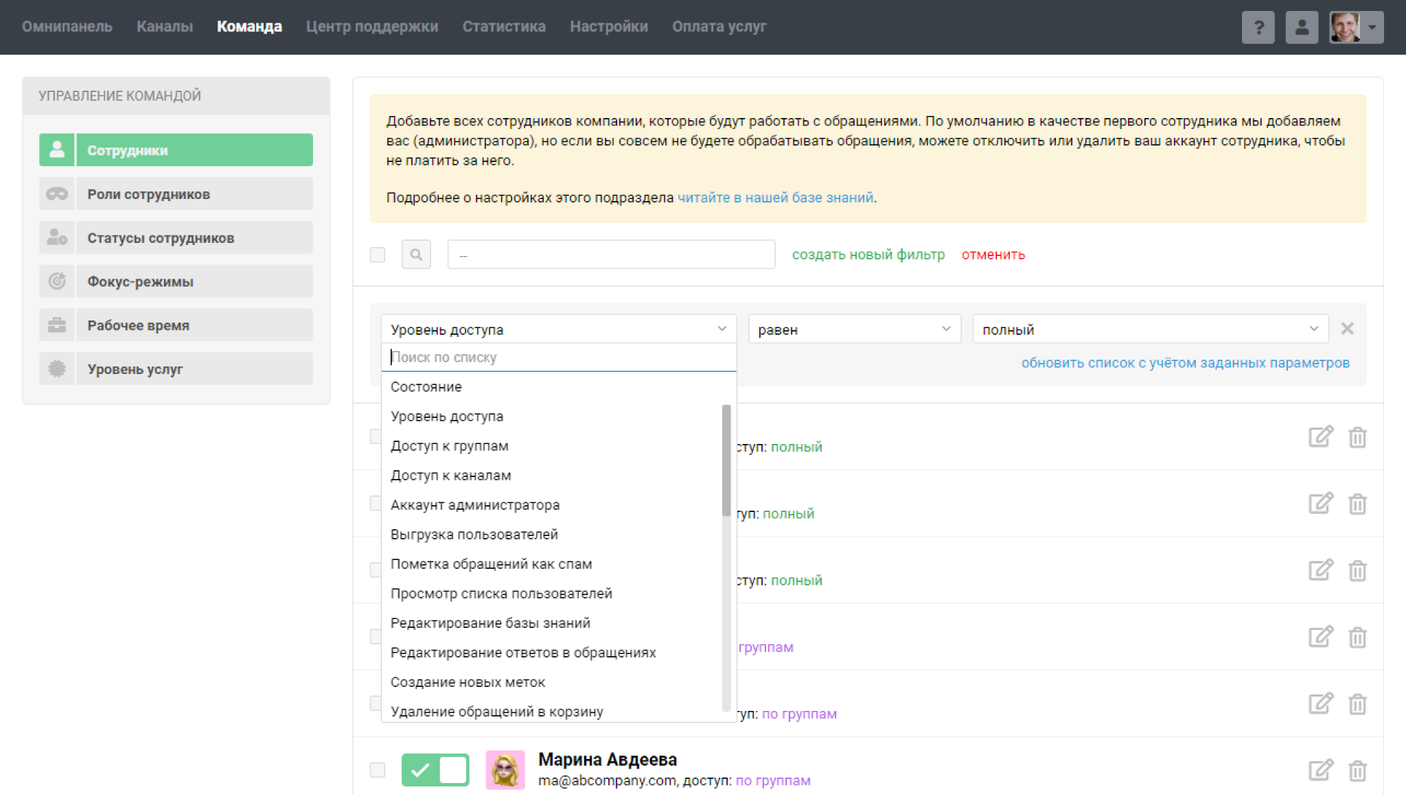 Полный доступ позволяет сотруднику видеть все обращения во всех группах. Этот уровень доступа следует назначать руководителям, менеджерам высшего звена или старшим саппортерам.
