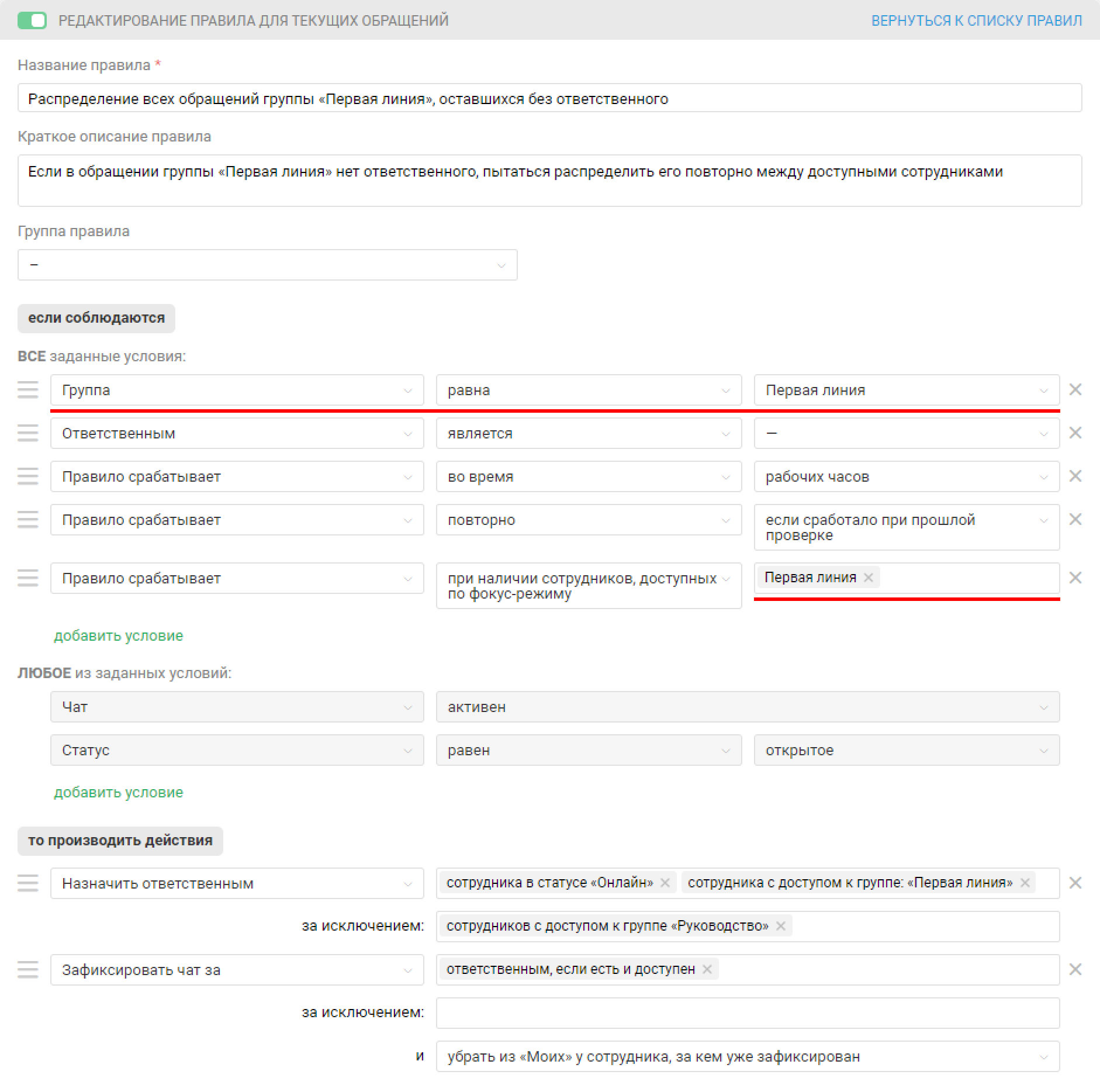 б) В правилах для распределения чатов (обращения по сообщениям из соцсетей, мессенджеров, кастомных синхронных каналов) в блоке «Все заданные условия» нужно добавить условие «Правило не срабатывает — при наличии не зафиксированных ни за кем чатов».