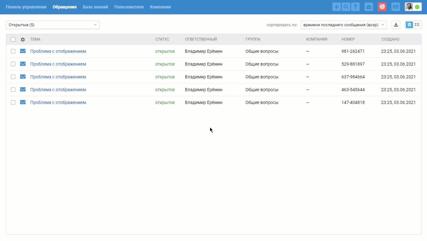 б) У сотрудника выставляется фильтр «Открытые», в котором он видит только свои открытые обращения, а чужие обращения и обращения без ответственного от него скрываются, чтобы сотрудник не отвлекался на них и не мог самостоятельно выбирать лёгкие обращения.